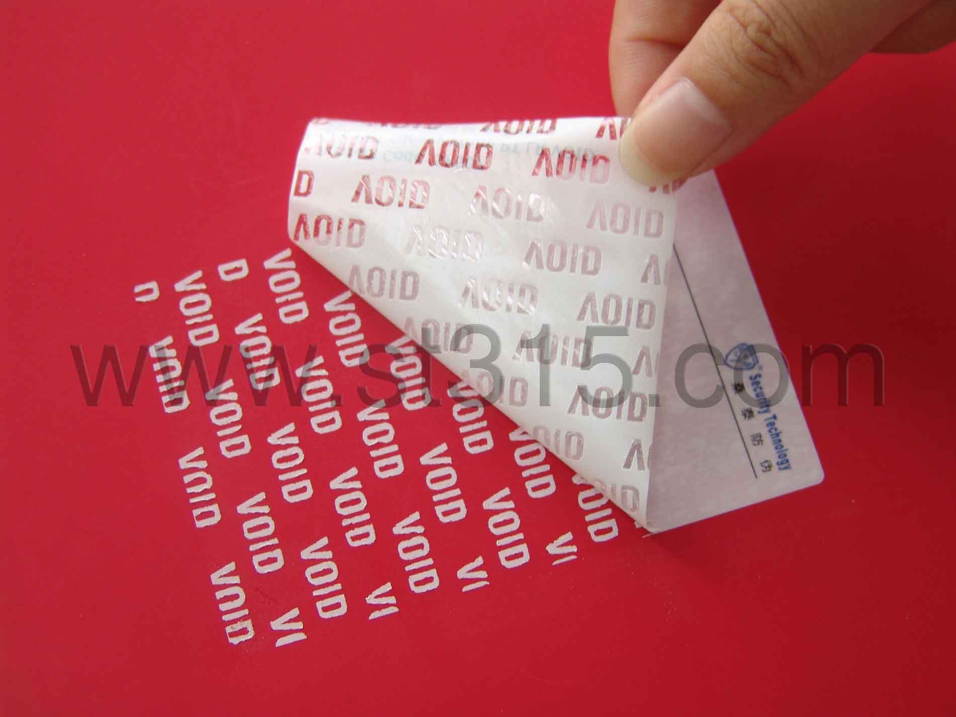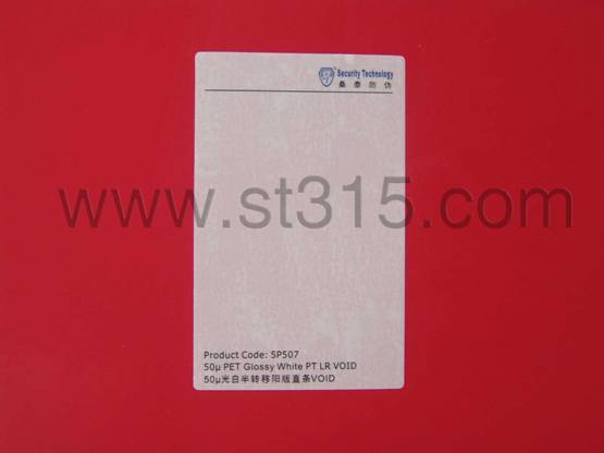 桑泰5P507防偽材料被揭起后,會(huì)有白色實(shí)體的“VOID”字樣(4.5MM高*11MM寬)平行排布在承貼物表面,同時(shí)鏤空的“VOID”也會(huì)顯現(xiàn)在標(biāo)簽面材上,不可復(fù)原,以示已開啟。有效地阻嚇盜竊、竄貨等不法行為的肆行。
