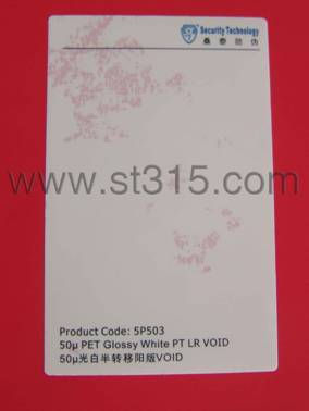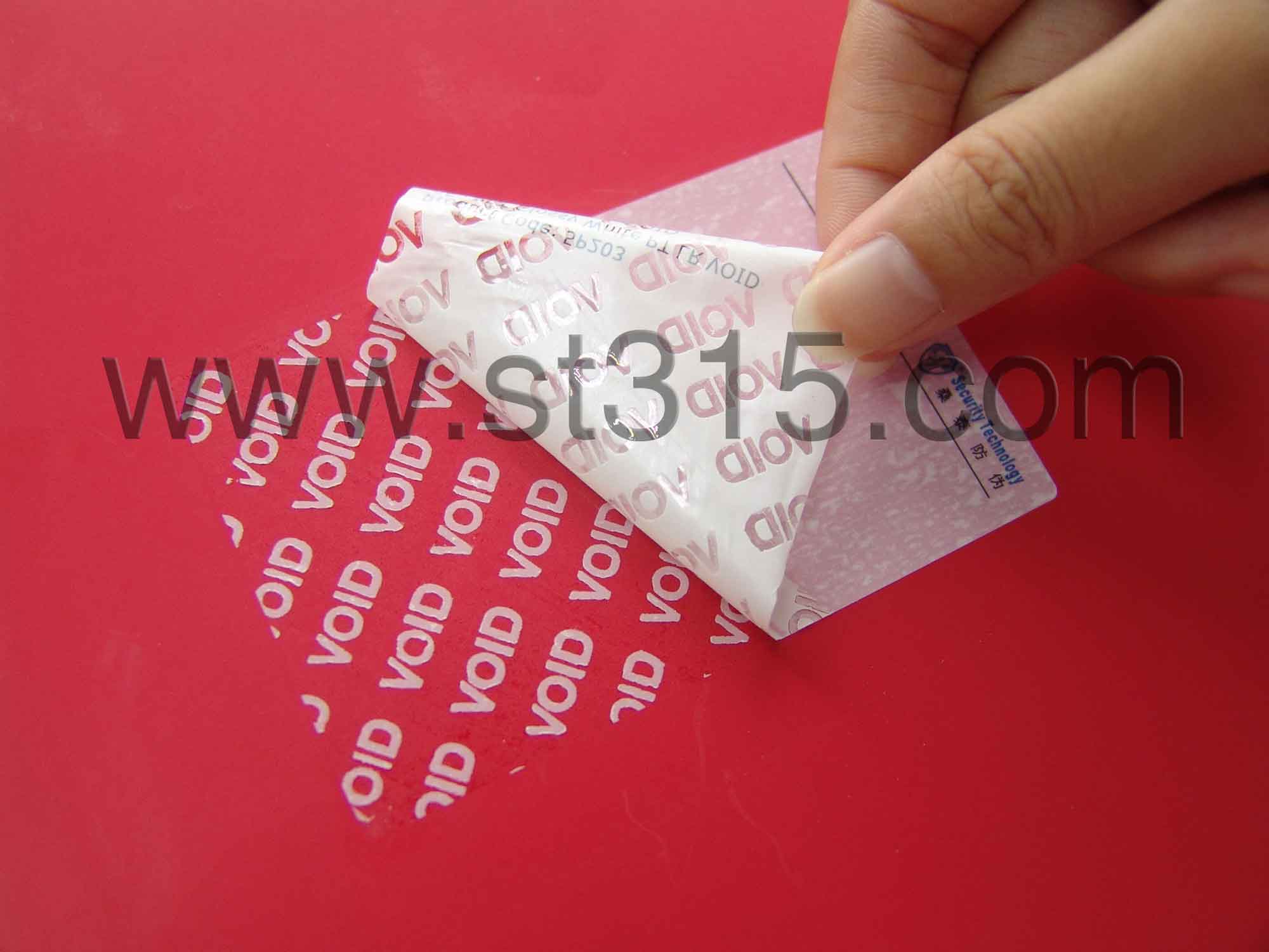 桑泰5P203防偽材料被揭起后,會有白色的“VOID”(4MM高*13MM寬)字樣轉(zhuǎn)移到承貼物表面,同時鏤空的“VOID”也會顯現(xiàn)在標簽面材上,不可復原,以示已開啟。有效地阻嚇盜竊、竄貨等不法行為的肆行。