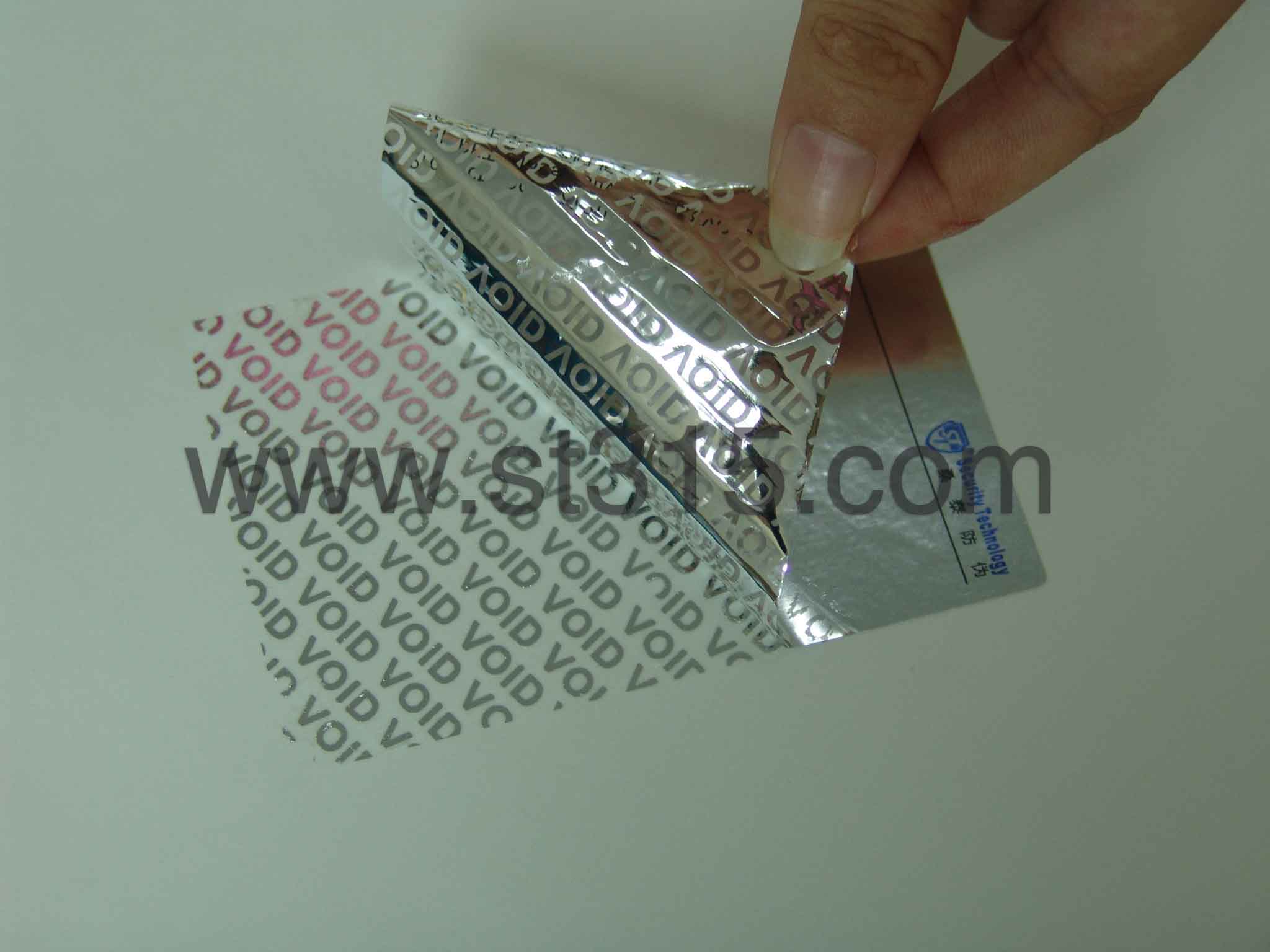 桑泰7T201防偽材料為亮銀色,材料一旦被揭起,銀色的“VOID”字樣就會轉移到承貼物表面,同時“VOID”銀色(3MM高*11MM寬)也會顯現在標簽面材上,成鏤空狀,不可復原,以示已開啟。有效地阻嚇盜竊、竄貨等不法行為的肆行。