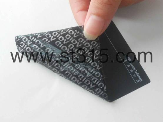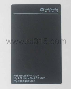 桑泰6N201/M為25#啞黑不轉移防偽材料,一旦被揭起,“VOID”字樣(3MM高*11MM寬)就會立刻顯現在標簽面材上,而被貼物表面無任何殘留,保證了被貼物表面的清潔。標簽破壞不可復原,以示已開啟。有效地阻嚇盜竊、竄貨等不法行為的肆行。