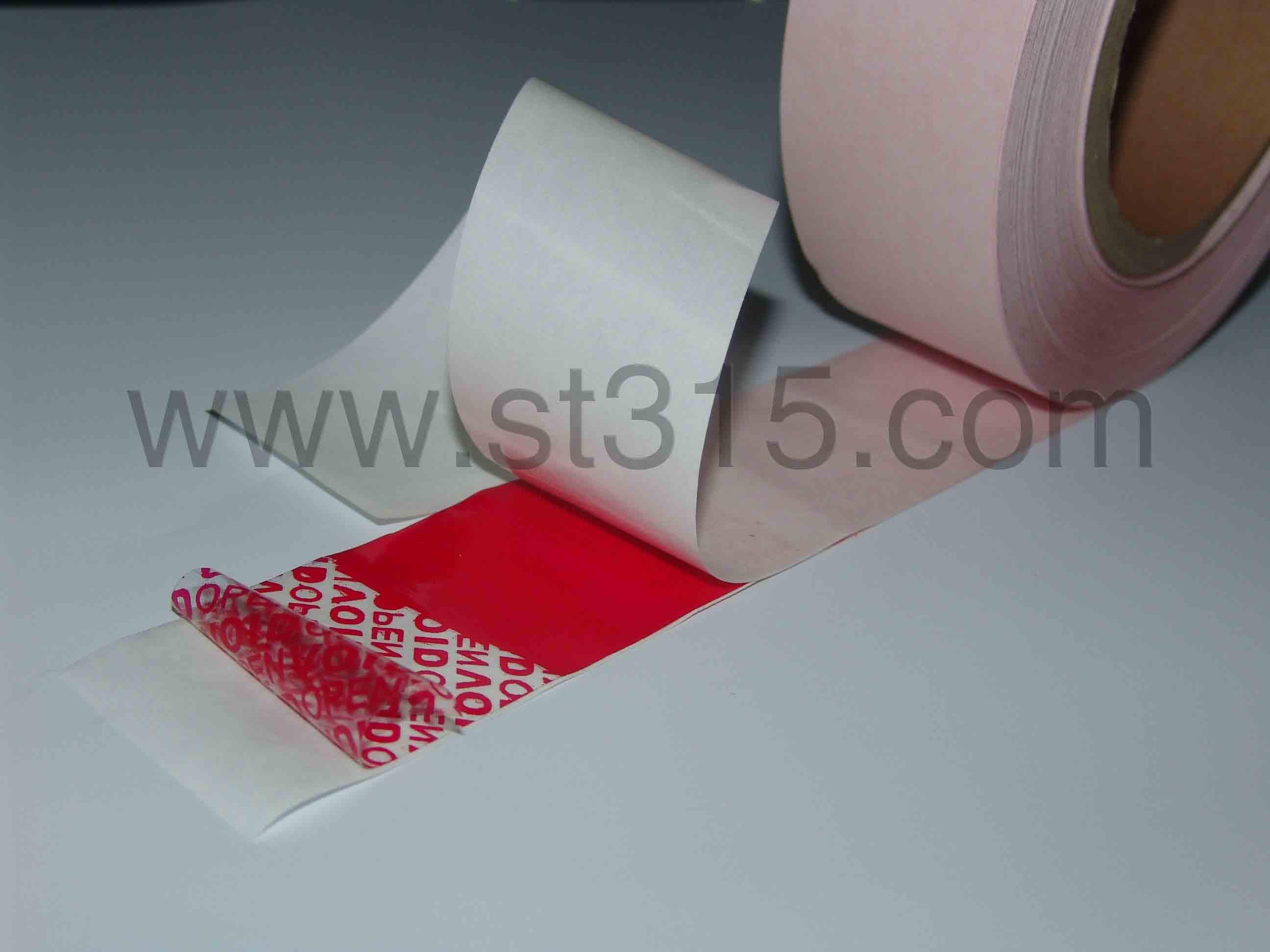 桑泰單面VOID雙面膠防偽封條是以PET膜為基材,且兩面均涂布有膠粘劑并兩面都復(fù)合著底材,其中一面膠粘劑含有防偽字模信息,主要用于塑料袋和信封上。常規(guī)顏色為紅色和藍(lán)色,底材可選用塑料膜或紙類。