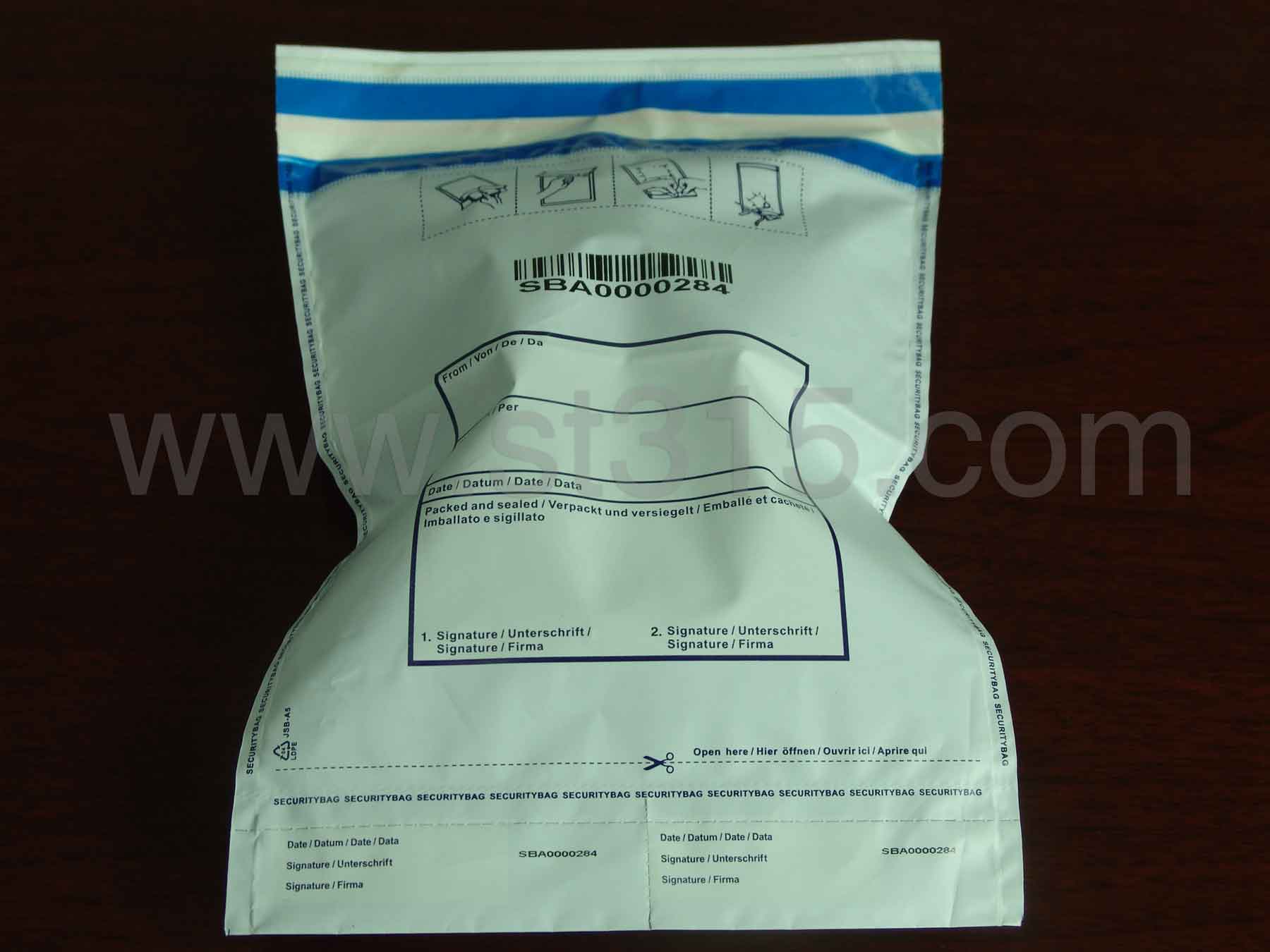 當安全密封袋一旦被打開,隱含的文字或圖案就會立即顯現在防偽封條上,并且永久的殘留在袋子上,以示已開啟。由于袋子不透明,可更有效地保護內載物件的安全。